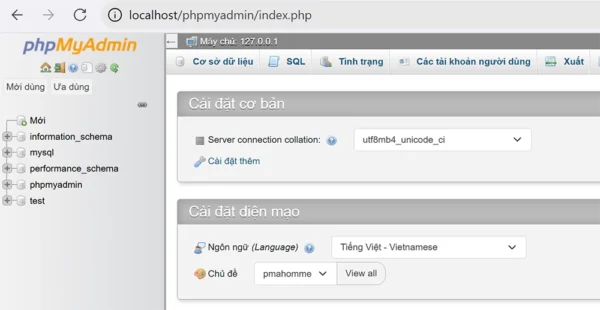 Mở trình duyệt web, truy cập: localhost/phpmyadmin