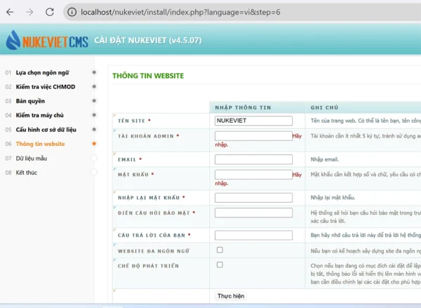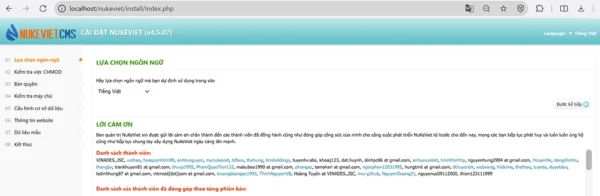 6. Mở trình duyệt web và truy cập đường dẫn localhost/nukeviet (hoặc tên thư mục của web bạn đã đổi trước đó) để tiến hành cài đặt web lên localhost. Bạn thực hiện theo các bước để cài đặt ➡️
